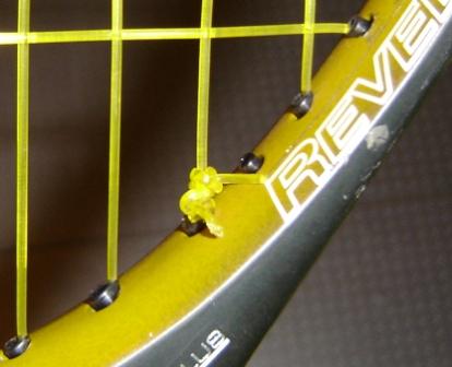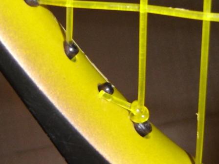 Ja, Ihr seht richtig: zwei Knoten auf einer Öse (und es sind genügend große Ösen da) und die letzte Quersaite fehlt völlig. Ok, bei der teuren Duralast muss man ja Material sparen.