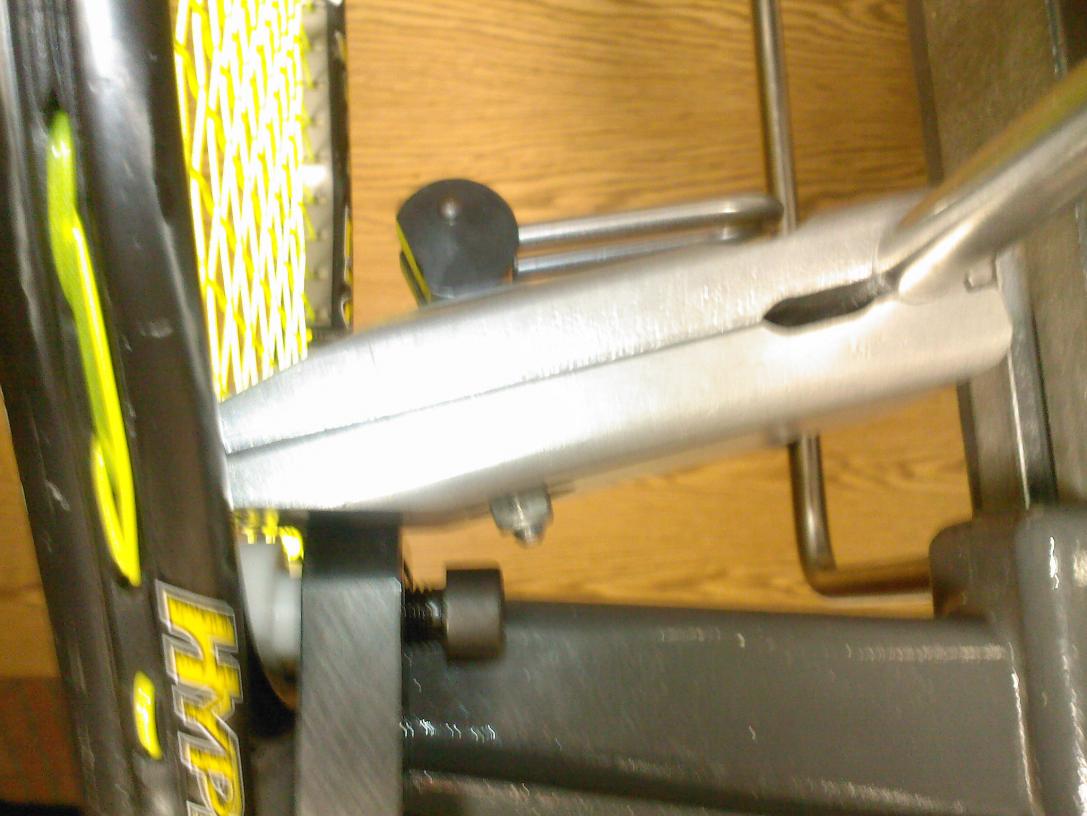 Wenn man die Längshalterschraube so einstellt, daß der sie im Rahmen ihres Spielraumes sehr weit innen sitzt rückt man dadurch vom Bespannkorb ab. Damit hast Du genug Platz für die Zangen.
