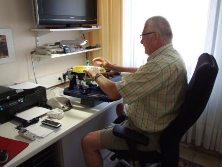 nach einigen fehlversuchen mit Tisch, Stuhl und Maschinen bin ich dann 1996 mit der 4 Maschine endlich zu dem zu sehenden Ergebnis gekommen (die Badminton Besaitungs Maschine steht im Schrank vor meinen Knieen dort wird auch die große hingestellt )