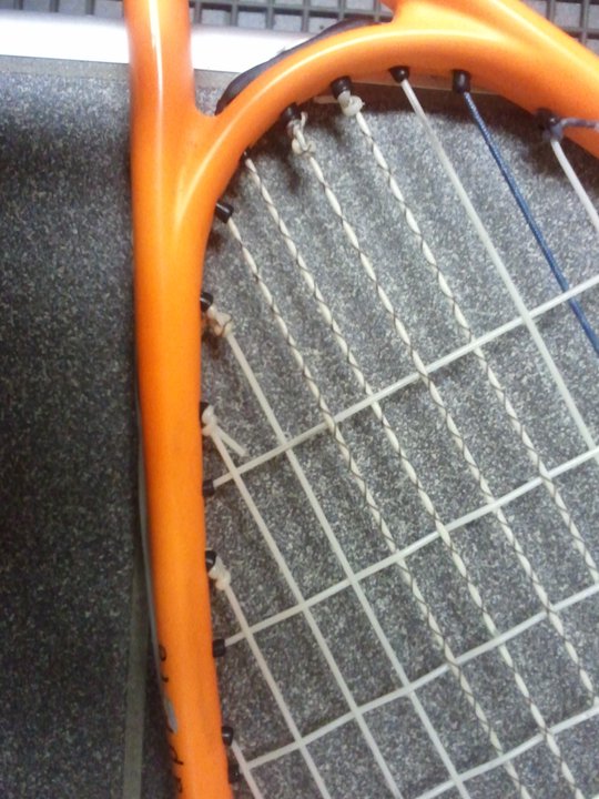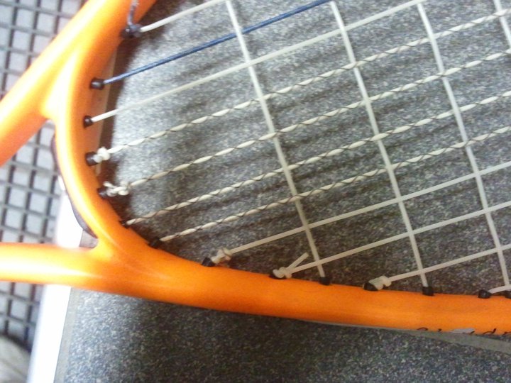 Nach 10 Minuten ist eine Längssaiten am Knoten gerissen. Zum glück hatte ich schon Bilder gemacht, denn der Schläger den mein Freund danach bekam, wurde nur ein mal geflickt ^^