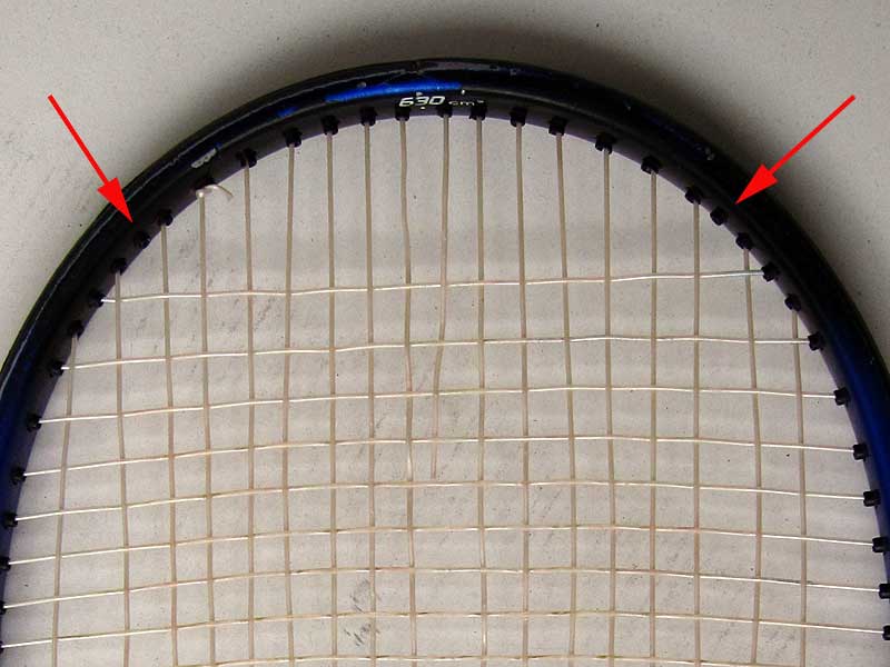 Aber wenn der Schläger nicht komplett unsymmetrisch war, geht das doch gar nicht. Eine Querseite benötigt 2 Ösen. Die bekommt man aber nur, wenn man eine Längssaite weglässt. Wenn man aber nur eine Querseite weglässt. Sind die auf einer Seite. Man müsste also, sowohl alle Längssaiten, als auch alle Quersaiten schief einziehen, um auf jeder Seite eine zusätzliche Öse zu erhalten. Dies muss man erkennen. Wenn er zwei Längssaiten weggelassen hat, wäre es zwar wenigstens symmetrisch, aber es wären dann 2 Quersaiten mehr.