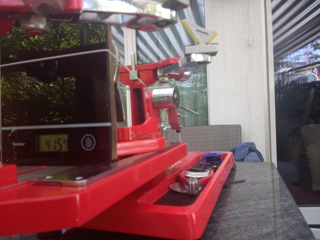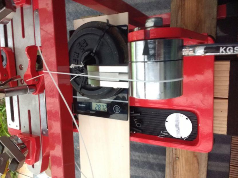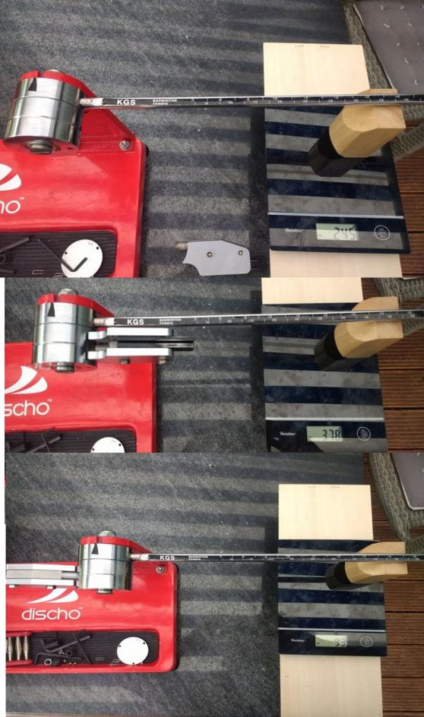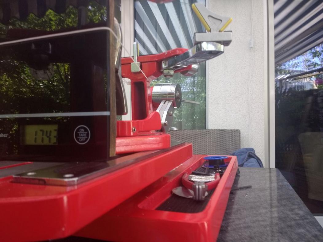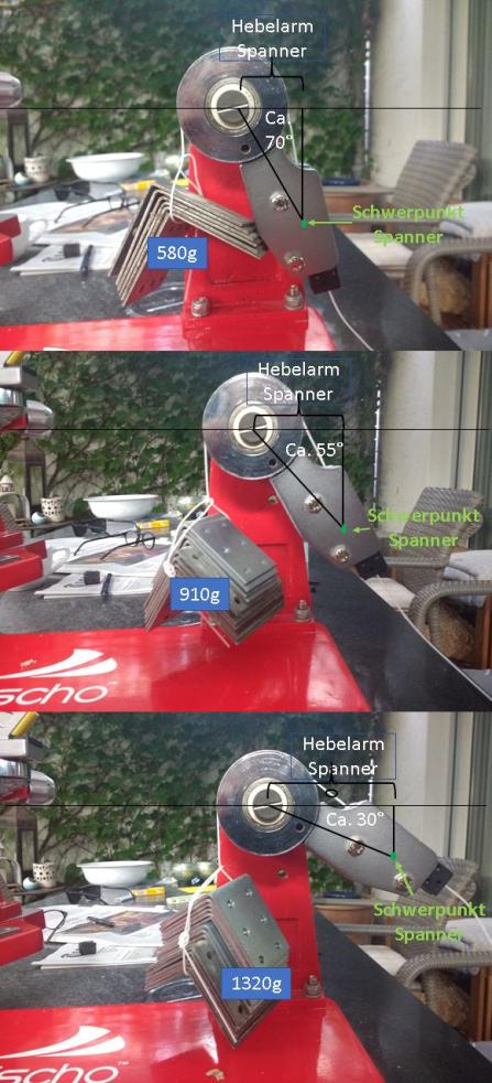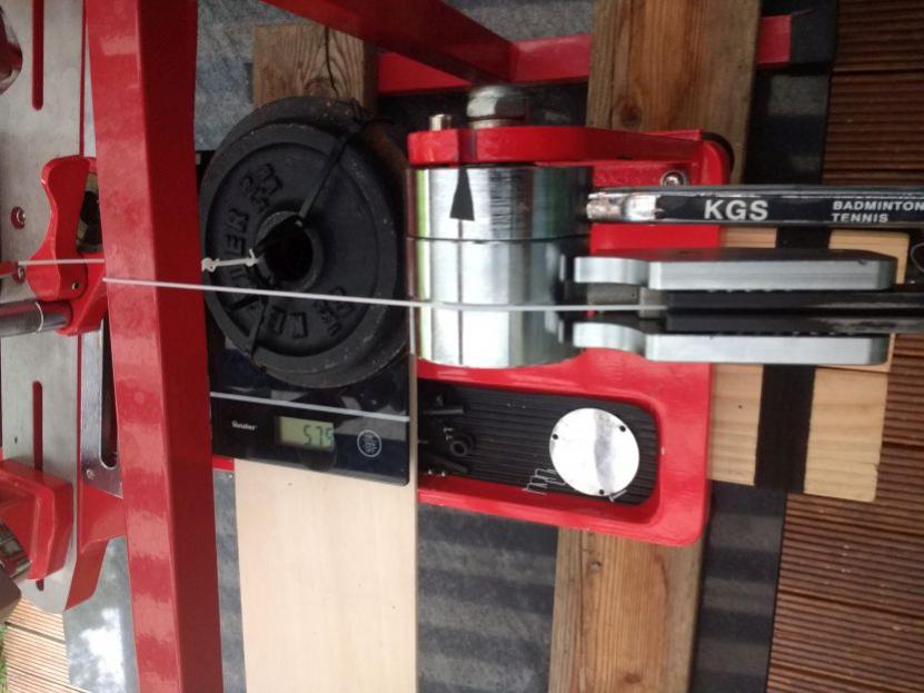 ich habe vor 3 Jahren angefangen selbst zu besaiten (Hebelarmmaschine mit linearem Schnellspanner) und seither irritiert mich etwas an der Konstruktion dieser Geräte, daher hab ich mich jetzt mal hier angemeldet.Der Spanner ist bei Maschinen dieser Art an das Hebelarmsystem gekoppelt, d.h. der Spanner erzeugt zusätzlich zum Einstellgewicht und der Stange ein Drehmoment und beeinflusst so die erzeugte Zugkraft. Je nach Elastizität der Saite, der Ausrichtung der Saite vor dem Einspannen und der Lage des Spanners vor dem einspannen, kommt der Spanner in der Endposition (Hebelarm waagerecht) völlig unterschiedlich zu liegen und übt so auch einen unterschiedlichen Einfluss auf die Zugkraft aus. Mein Spanner wiegt 625g, der Schwerpunkt des Spanners liegt grob geschätzt etwas mehr als doppelt so weit vom Drehpunkt entfernt wie der Radius der Umlenkrolle, d.h. falls die Endlage des Spanners genau horizontal auf derselben Seite wie das Gewicht zu liegen käme (nicht realistisch) hätte ich ein zusätzliches Gewicht von etwa +1.5kg, falls er horizontal auf die gegenüberliegende Saite zu liegen kommt von -1.5kg. Realistisch sind wohl etwa Winkel von gut 45Grad auf der einen oder anderen Saite, was immer noch einen Unterschied von etwa 2kg ausmachen würde. Ich hab mal das Gewicht entfernt und die erzeugte Zugkraft nur von der Stange und dem Spanner in unterschiedlichen Positionen gemessen und habe diese 2kg Differenz auch bestätigt. Also je nach Ausgangslage Spanner, Saite usw bekomme ich eine ziemlich deutliche Abweichung vom eingestellten Zuggewicht, bei einem runden Schnellspanner taucht das Problem natürlich nicht auf.