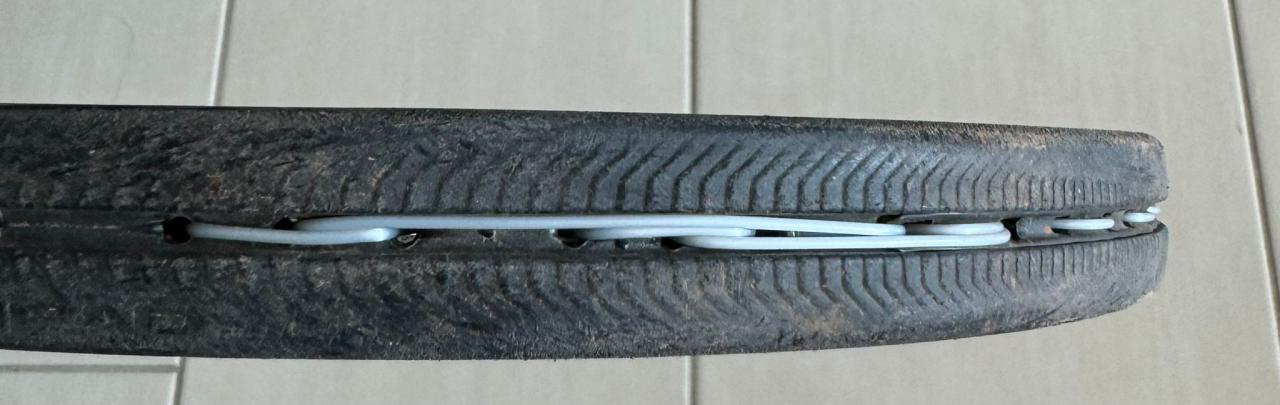 War auf einem ITF Jugendturnier. Da hatte wohl jemand keinen Seitenschneider gehabt um den Rest from Knoten auf die richtige Laenge zu schneiden. Stattdessen wurde das Ende einfach da zwischenrein gesteckt...